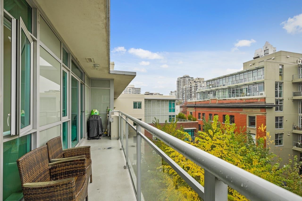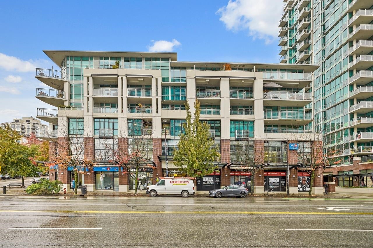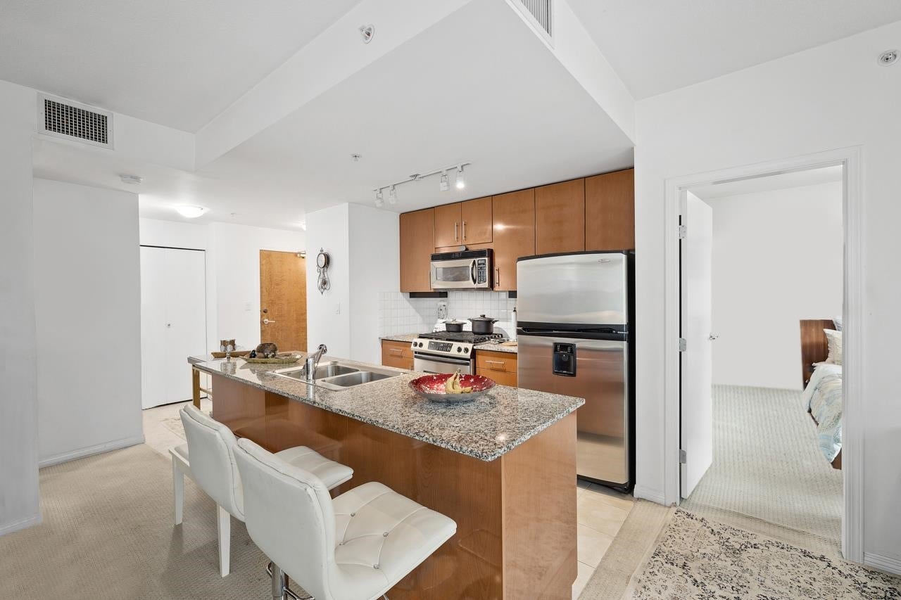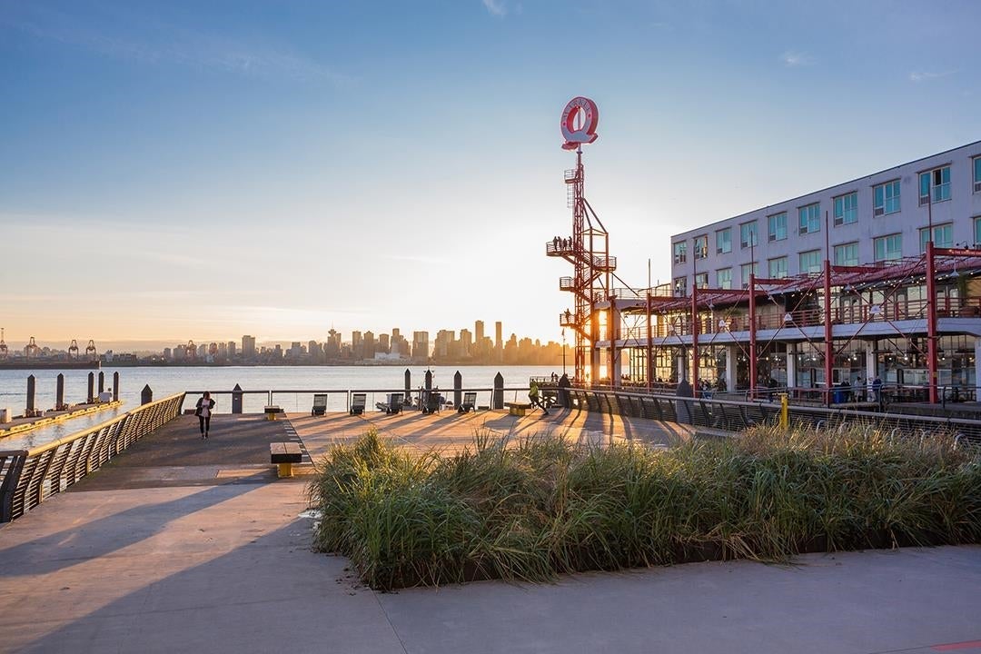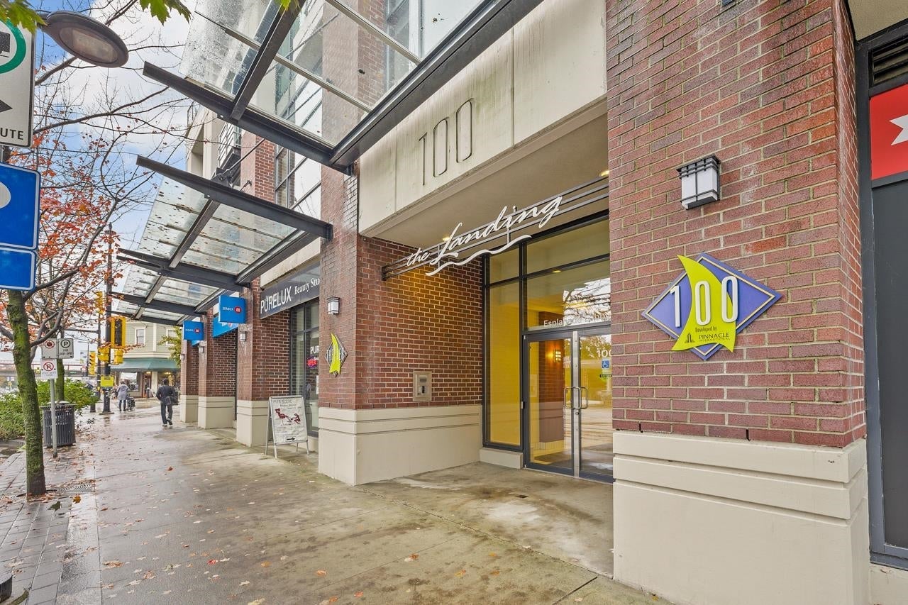 PENTHOUSE corner suite now available for the first time on the market! This 2 bed, 2 bath condo offers a wide corner floor plan w/ floor-to-ceiling windows with views of historic Lower Lonsdale buildings over a quiet tree-lined street. Enjoy separated bedrooms & large principle rooms. The open plan kitchen boasts an entertainer's island w/ granite counters, gas range & wood tone cabinetry. Lrg master suite w/ His & Her closets & 4 pc ensuite. Dual access to the spacious balcony from both the master bedroom & living space - in addition to a Juliet balcony for a beautiful cross breeze. AIR CONDITIONING, 1 parking & use of the pool/gym/amenities at the Pinnacle hotel for a sm. monthly fee. Pets & rentals allowed. Step to Seabus, Quay & Shipyards! Showing Thur 4:30-6pm, Sat 2:30-4pm or by apt.