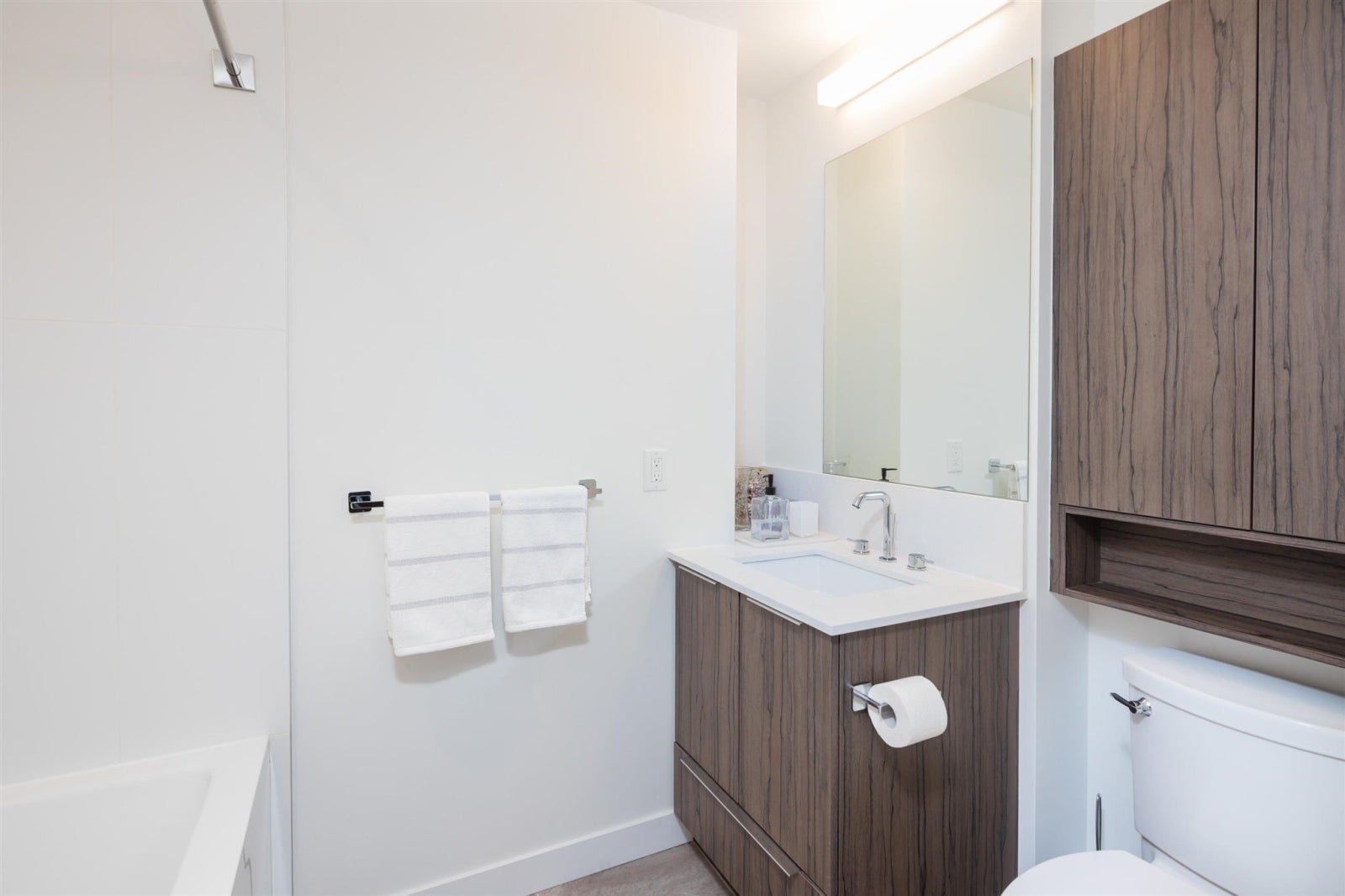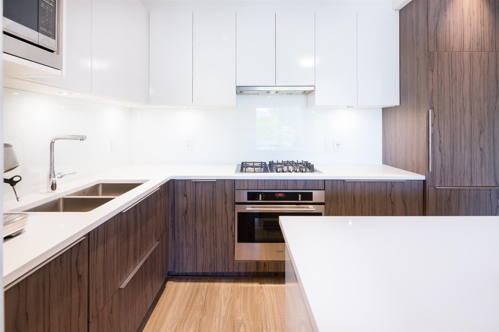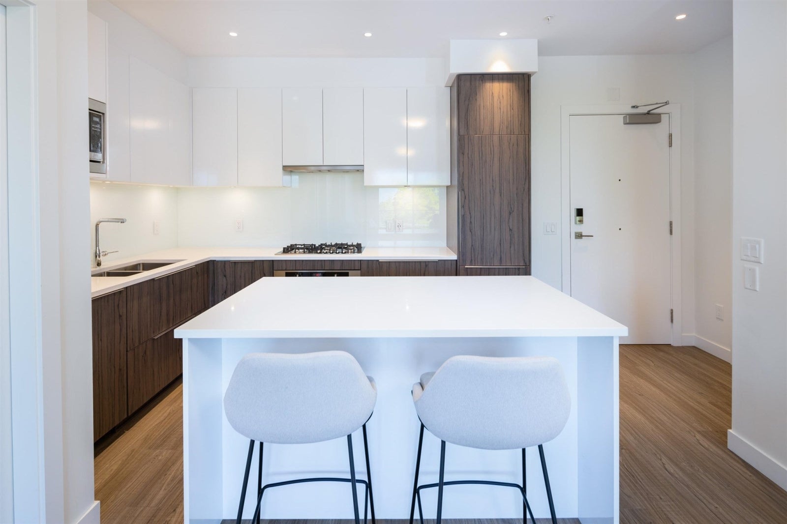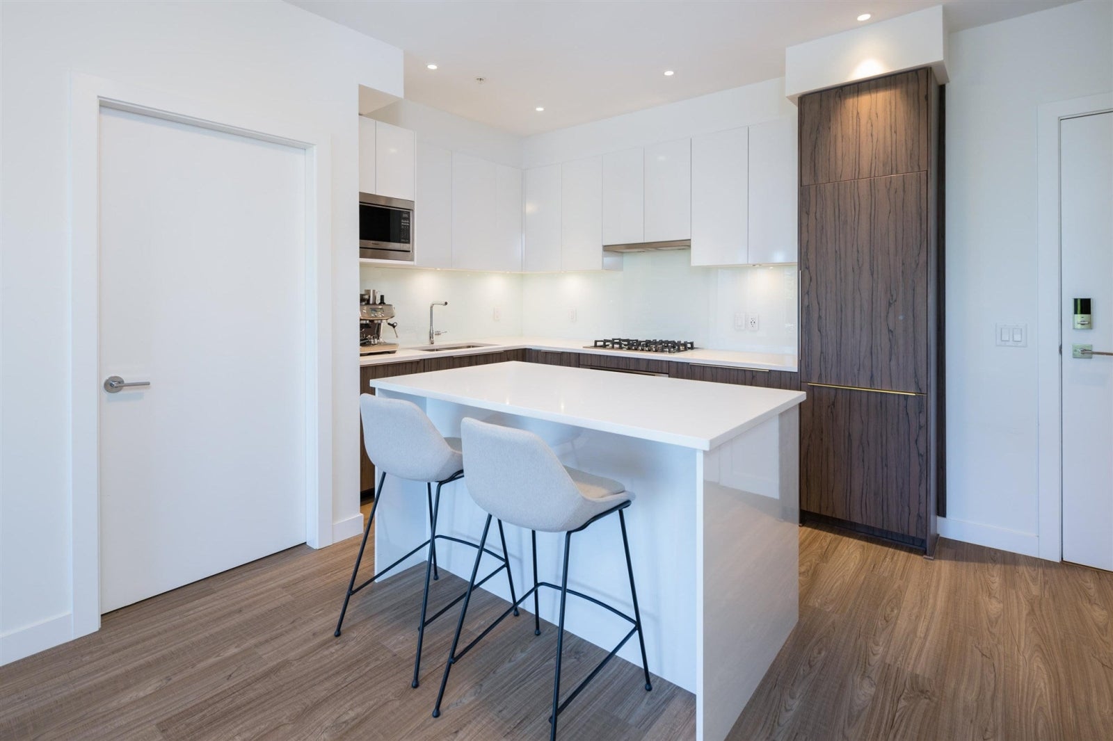 WELCOME TO SYNCHRO - Come home to a quiet north facing 2 bedroom 2 bathroom plus den home with a large outdoor patio! Beat the summer heat with air conditioning. Fully integrated SMART HOME with digital door lock and thermostat. This home features an efficient layout, high end laminate flooring, 9 foot ceilings, roller blinds, a custom kitchen island, California Closets and more. This impeccable kitchen features quartz countertops, a custom kitchen island, Blomberg & Fulgor SS appliances & hood fan. This home welcomes you w/ abundant light in each room as you are greeted w/unobstructed North Mountains and Expansive Vancouver Skyline Views. Seeing is believing: rental and pet friendly, 1 large parking stall and 1 secured storage.