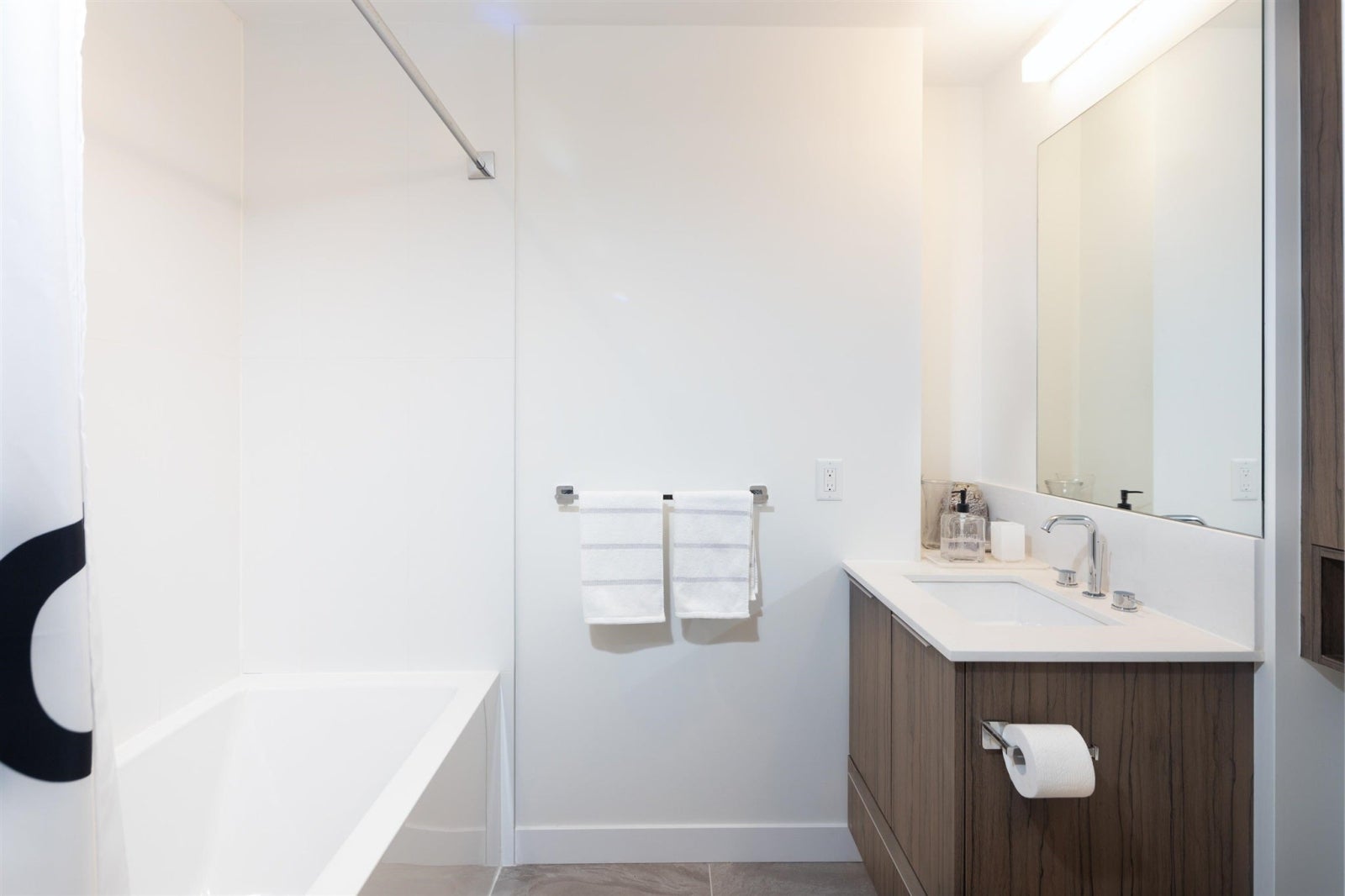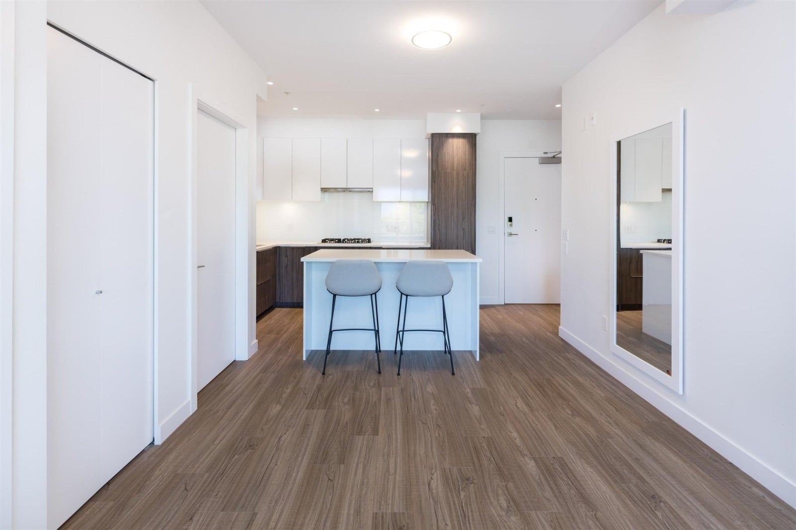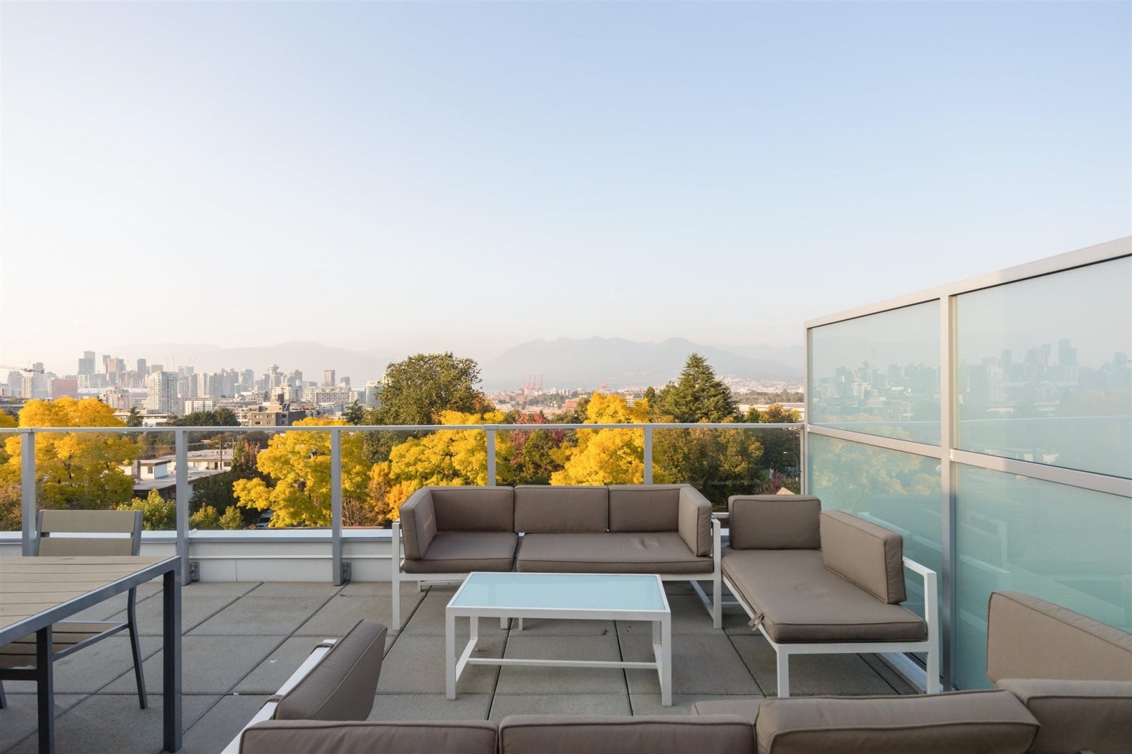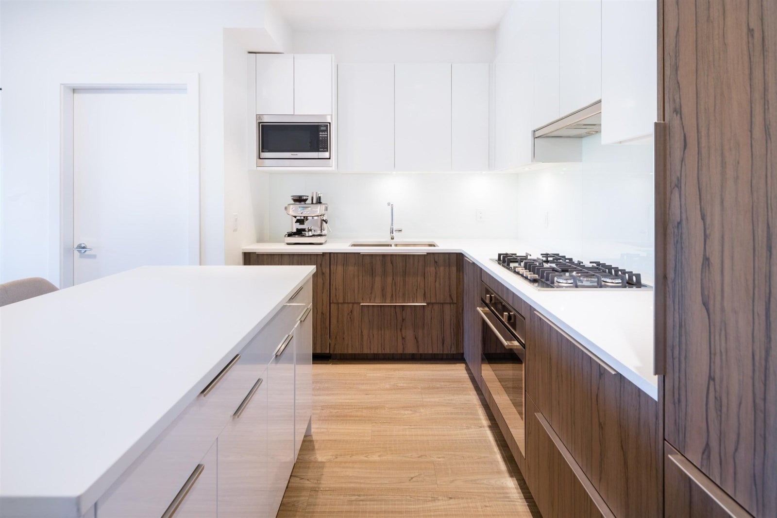 WELCOME TO SYNCHRO - Come home to a quiet north facing 2 bedroom 2 bathroom plus den home with a large outdoor patio! Beat the summer heat with air conditioning. Fully integrated SMART HOME with digital door lock and thermostat. This home features an efficient layout, high end laminate flooring, 9 foot ceilings, roller blinds, a custom kitchen island, California Closets and more. This impeccable kitchen features quartz countertops, a custom kitchen island, Blomberg & Fulgor SS appliances & hood fan. This home welcomes you w/ abundant light in each room as you are greeted w/unobstructed North Mountains and Expansive Vancouver Skyline Views. Seeing is believing: rental and pet friendly, 1 large parking stall and 1 secured storage.