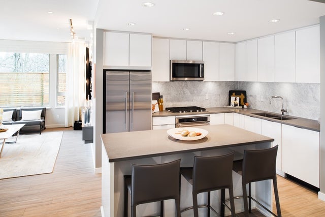 675 sq. ft., 1 bed, 1 bath home features an open concept layout, 9' ceilings, rich laminate flooring with in-floor heating, and plush nylon carpeting in bedrooms. The gourmet kitchen boasts polished quartz countertops, marble backsplash, and sleek stainless steel appliances by Kitchen Aid and Fisher & Paykel.